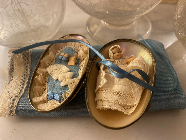 Toy made in the style of antique toys and using antique materials: mother-of-pearl egg, antique doll, fabric scraps. Entirely handmade.