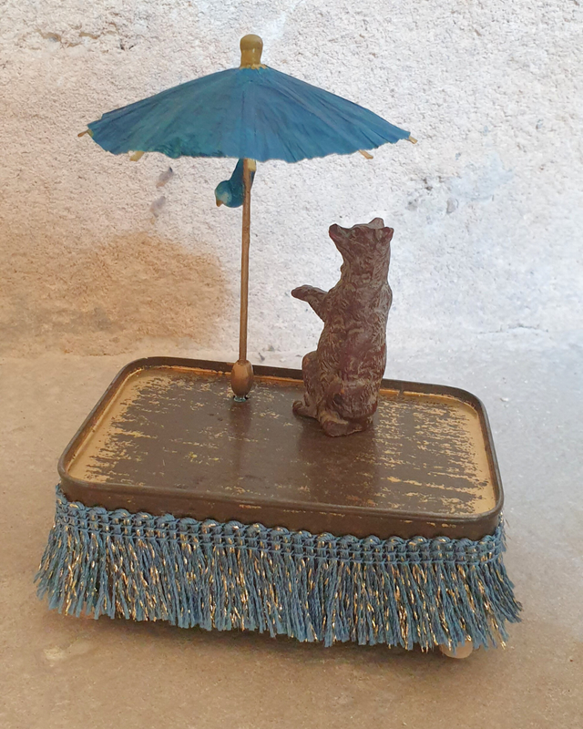 Hand-cranked music box, made from an old tin box, a toy figurine, a paper umbrella and a clay, handmade bird. Made in our workshop in Bordeaux, with patience and care. One-of-a-kind piece.