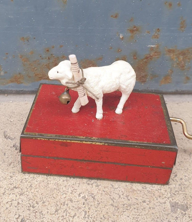 Petite boîte à musique réalisée avec une boîte en métal ancienne et un santon, portant un rouleau de partition de boîte à musique. 7 cm de long environ.